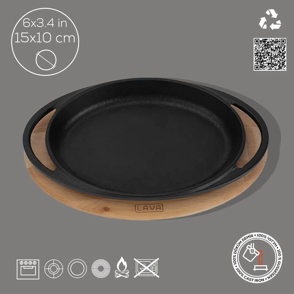 | Tags | Lava Cast Iron Oval Skillet. Dual Handle, With Wooden Platter 15X10cm. |