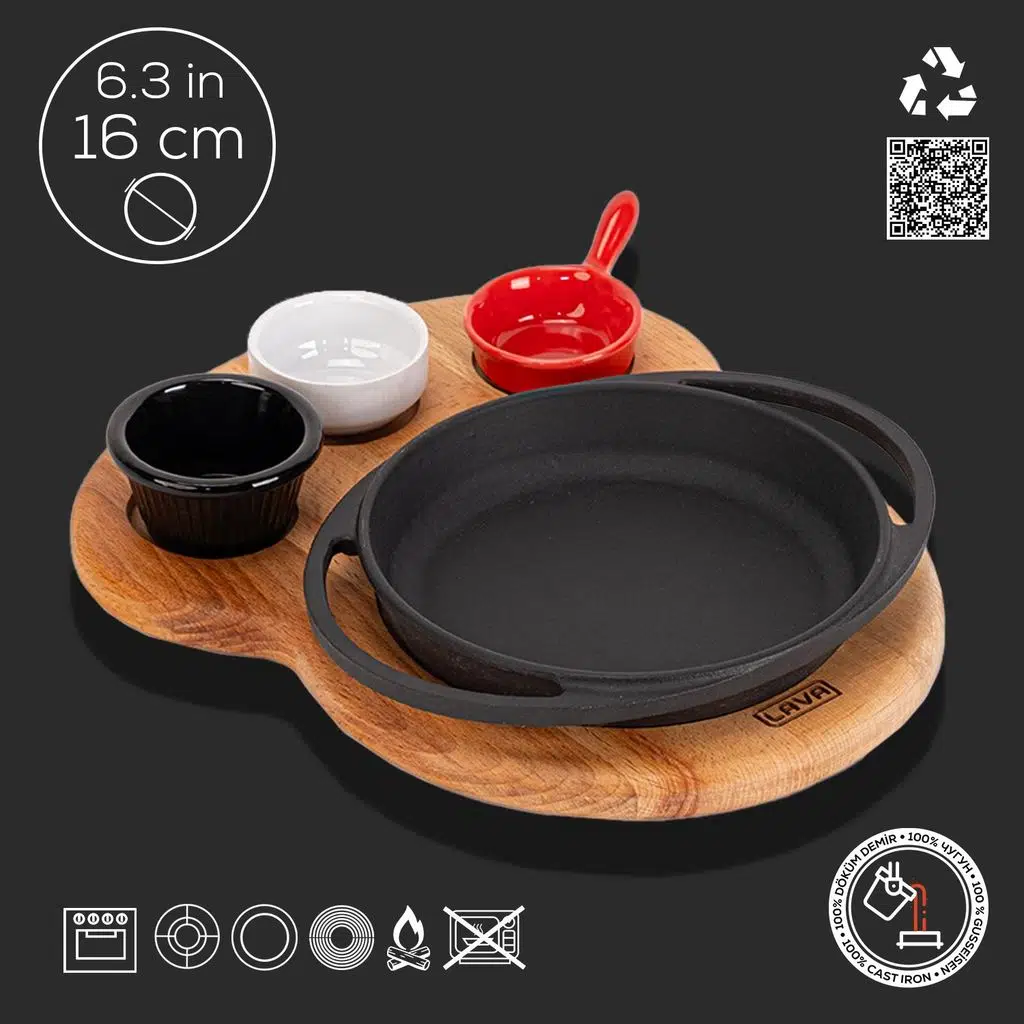 | Tags | Lava Cast Iron Round Sets With Wooden Serving Platters. Dual Handle, With Wooden Platter Dia. Ø 16cm. |