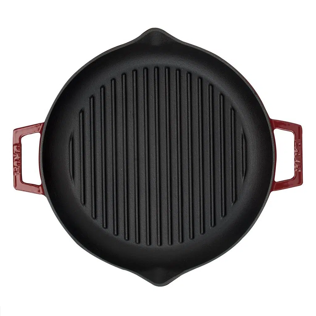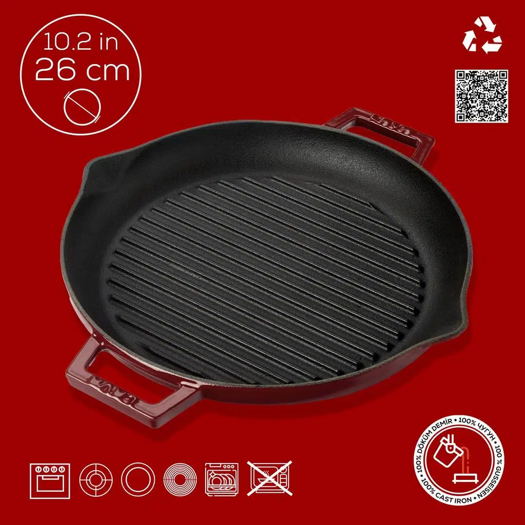 Çift kulpu sayesinde rahat bir tutuş sağlayan LAVA Döküm Yuvarlak Izgara Tava’nız ile ağız sulandıran biftekler, dolgun köfteler ve çeşnili ızgara sebzeler hazırlayabilir; pratik yağdanlıkları ile yağ ve su gibi sıvıları boşaltabilir, etkileyici soslar servis edebilirsiniz. Mangal lezzetinde bir et için, LAVA Döküm Yuvarlak Izgara Tava’nızı yağ, su vb. maddeleri koymadan yüksek ateşte ısıtarak başlayınız. Dökümünüz yeteri kadar ısındıktan sonra kısık-orta ateşe alarak etlerinizi veya sebzelerinizi mühürlemeye başlayabilirsiniz. Etlerinizi veya sebzelerinizi çevirirken çatal gibi yüzeyi delebilecek araçlar yerine, maşa kullanarak kurumalarını önleyebilirsiniz.