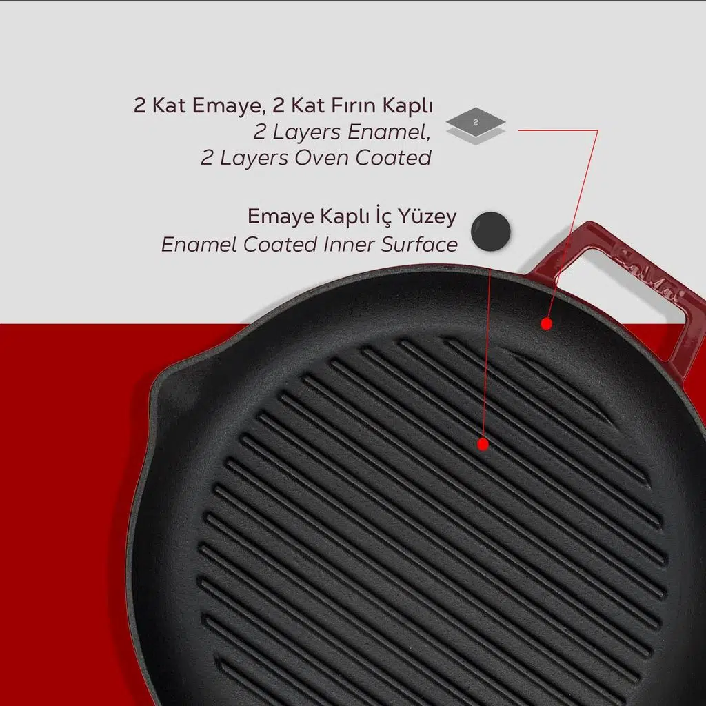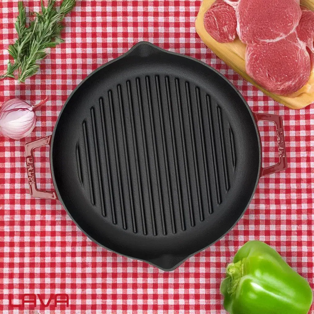 LAVA Döküm Yuvarlak Izgara Tava’nız, mühürleme yöntemi ile sizi ağız sulandıran yemeklerle buluştururken, istenmeyen su salınımını önleyerek besin değerlerinin kaybolmasını engeller. %100 geri dönüştürülebilir ve kanserojen içermeyen LAVA’nız, sağlıklı yaşam ve sürdürülebilir bir çevre için mutfağınızda atabileceğiniz bir adımdır.