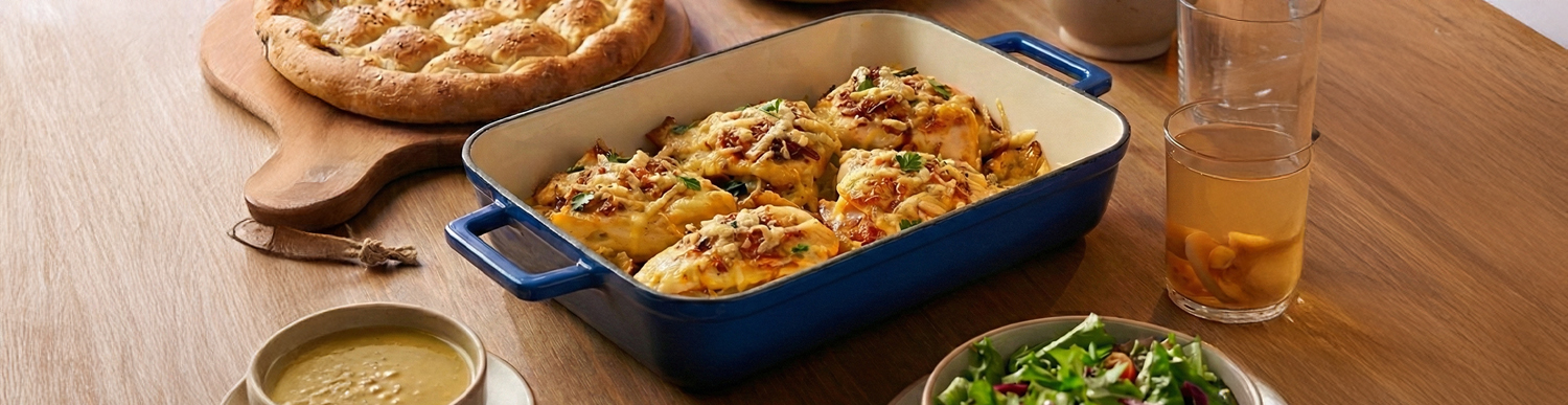 Bake: Transfer the chicken and vegetable mixture into a baking dish. Pour over the béchamel sauce and sprinkle grated cheddar cheese on top. Bake in a preheated oven at 180°C for 25–30 minutes.