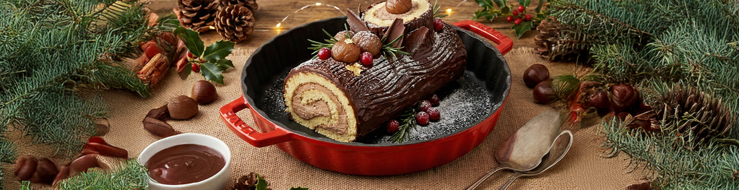 Yule Log’un sıcak çikolata tonları ile dökümün derin dokusu birleştiğinde sofraya hem geleneksel hem çağdaş bir yılbaşı estetiği taşır.