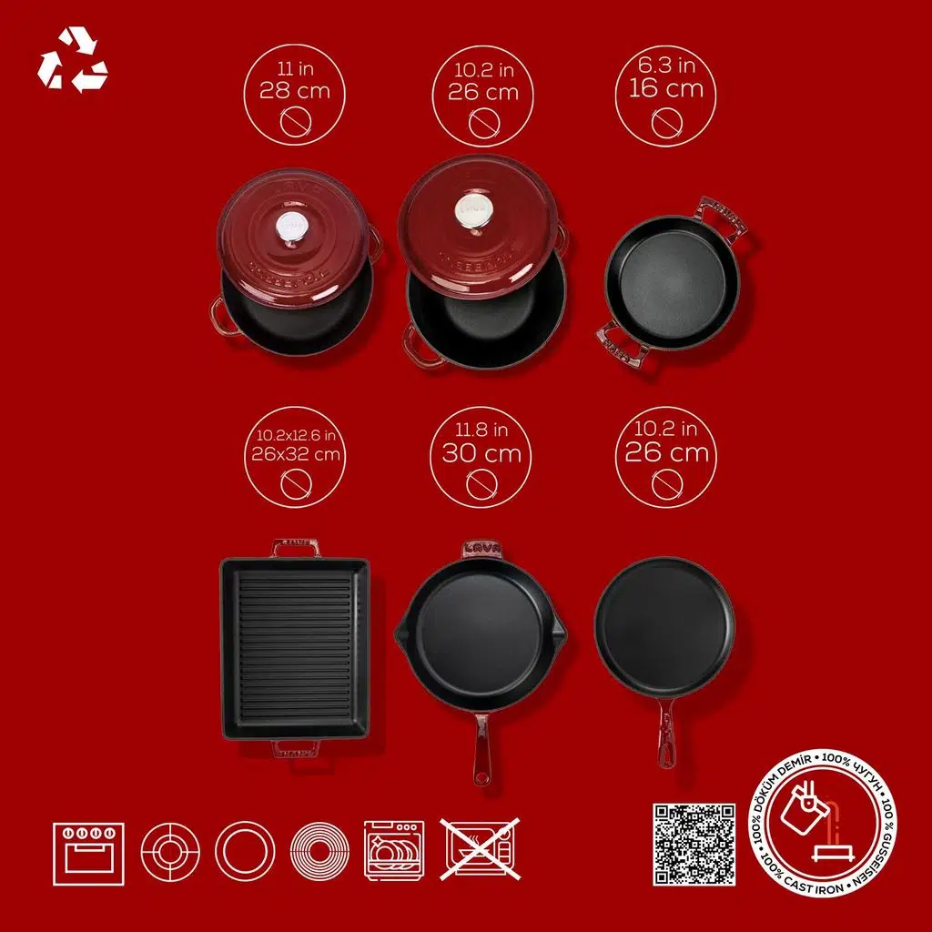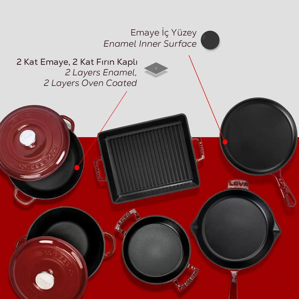 LAVA döküm demir emaye tencere ve tavalar yüksek yüzey sıcaklığında haşlama için olduğu kadar, geleneksel kısık ateşte pişirme için de etkilidir, seçim sizin..