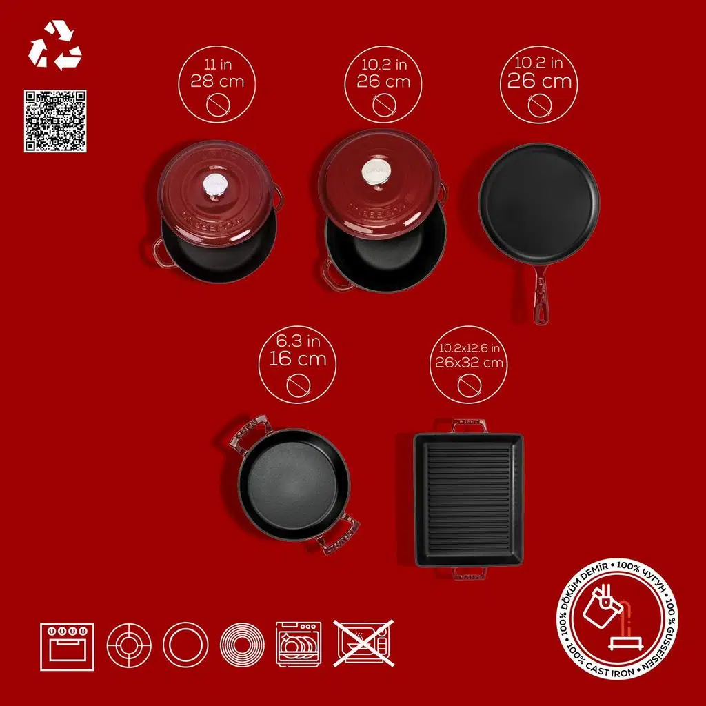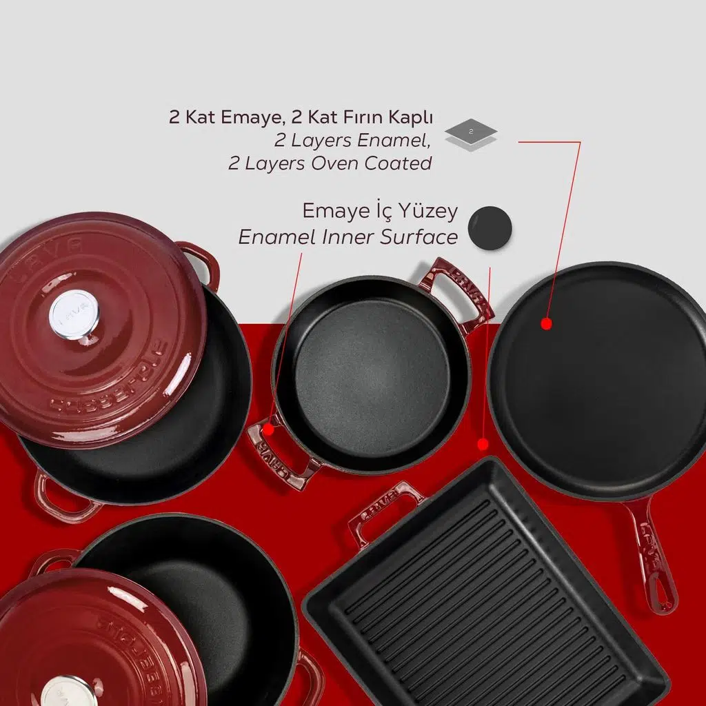 Döküm Demir Tava Tencereler; dünyada sadece birkaç firmada bulunan yüksek emaye kaplama teknolojisi sayesinde bulaşık makinesinde yıkanır, pratik ve kolay temizlenir. Bu sebepten diğer rakiplerinin emaye yapısından daha dayanıklı, daha kullanışlı ve teknik olarak daha üstündür.