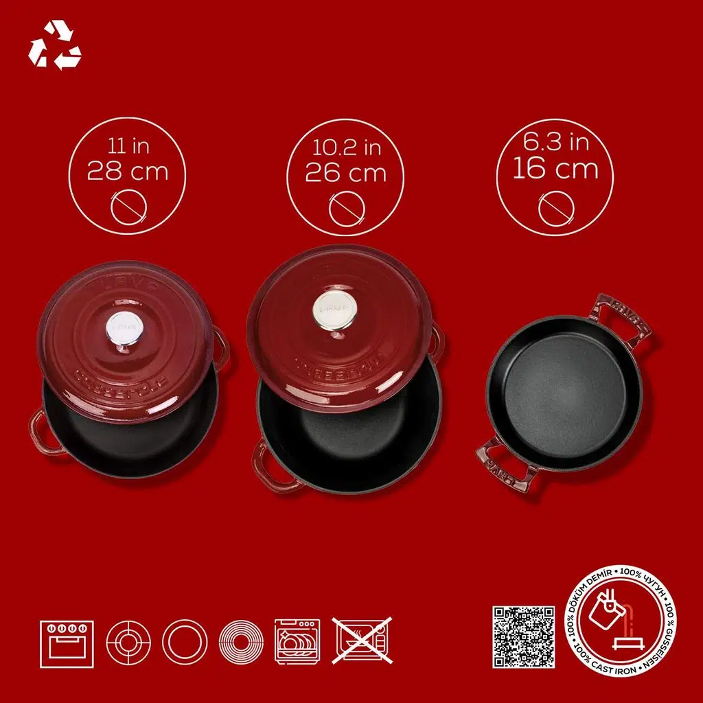 1 Adet - Sığ Çok Amaçlı Tencere. Yuvarlak. Ø 28cm. Döküm Demir. Yekpare Kulplu. Emaye 3 Kat, 2 Fırın.Döküm Demir Kapak. Metal Tepe.