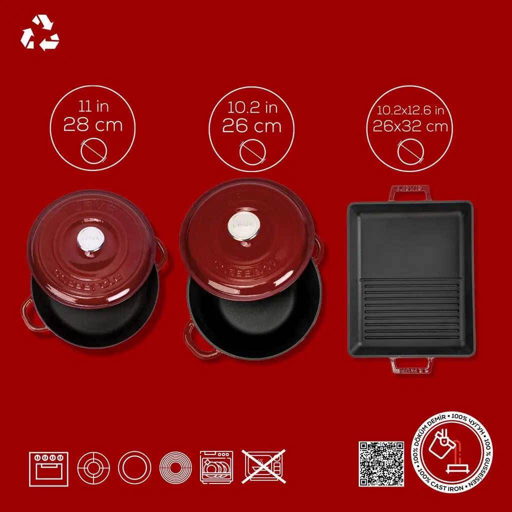 1 Adet - Sığ Çok Amaçlı Tencere. Yuvarlak. Ø 28cm. Döküm Demir. Yekpare Kulplu. Emaye 2 Kat, 2 Fırın.Döküm Demir Kapak. Metal Tepe.