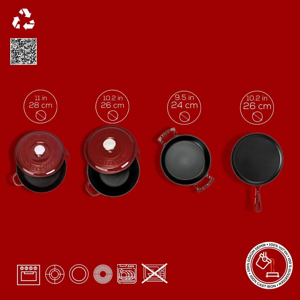 Döküm Demir Tava Tencereler; dünyada sadece birkaç firmada bulunan yüksek emaye kaplama teknolojisi sayesinde bulaşık makinesinde yıkanır, pratik ve kolay temizlenir. Bu sebepten diğer rakiplerinin emaye yapısından daha dayanıklı, daha kullanışlı ve teknik olarak daha üstündür.