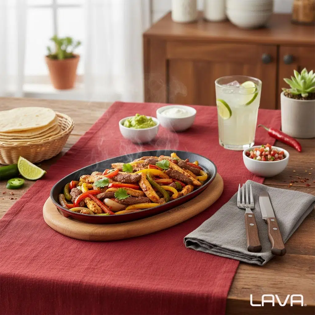 LAVA Döküm Fajita Tavaları ile dünya mutfağı elinizin altında. Özel olarak Meksika mutfağı için tasarlanan LAVA Döküm Fajita Tavaları, yüksek ısı dayanıklılığı ve ısı tutma özellikleriyle yemeklerinizi uzun süre yağları donmadan sıcak tutar. Birbirinden farklı şekilleri ile her ihtiyacınıza yanıt verirken kayın servis ahşapları ile şık ve profesyonel bir sunum hazırlamanıza yardımcı olur.