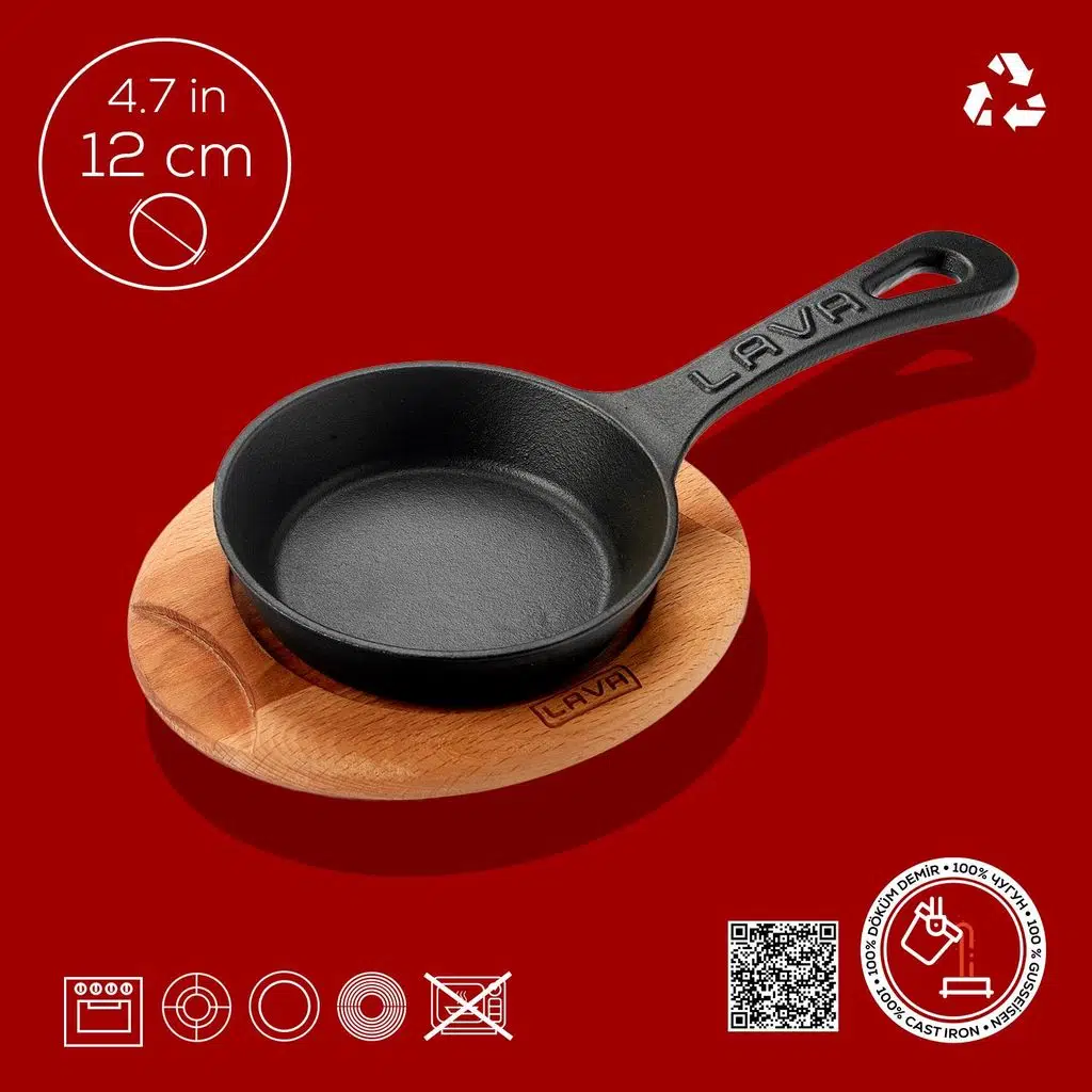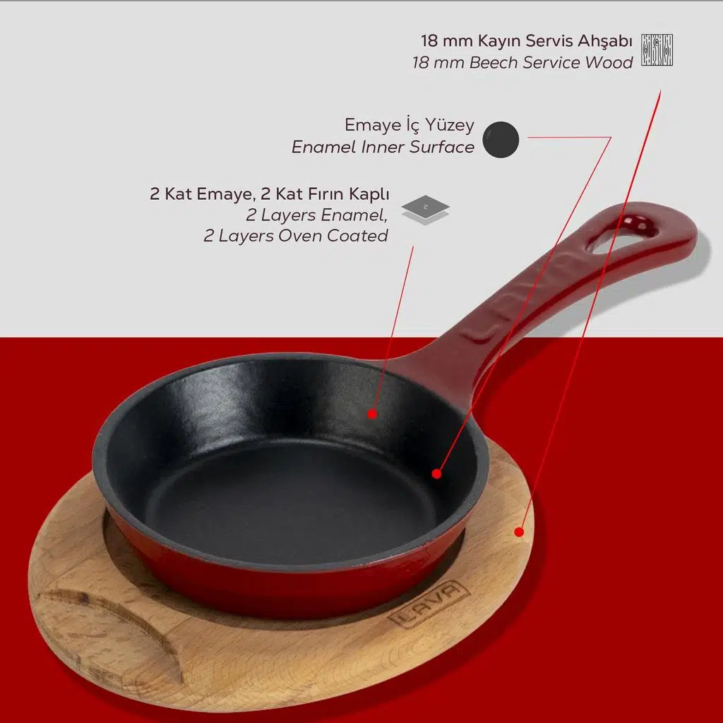 LAVA Döküm Yuvarlak Saplı Tava ile et ve balık kızartabilir, sebze soteleyebilir veya dünya mutfaklarından esinlenerek yaratıcı bir kızarmış pirinç yapabilirsiniz. Aynı zamanda, mühürleme yöntemi ile mangal tadında lezzetler hazırlayabilirsiniz. Yüksek ısı dayanıklılığına ve ısı tutma özelliği sayesinde, LAVA Yuvarlak Saplı Tava ile uzun süre sıcak kalacak sunumunuzu, şık kayın ahşap altlığı ile tamamlayabilirsiniz.