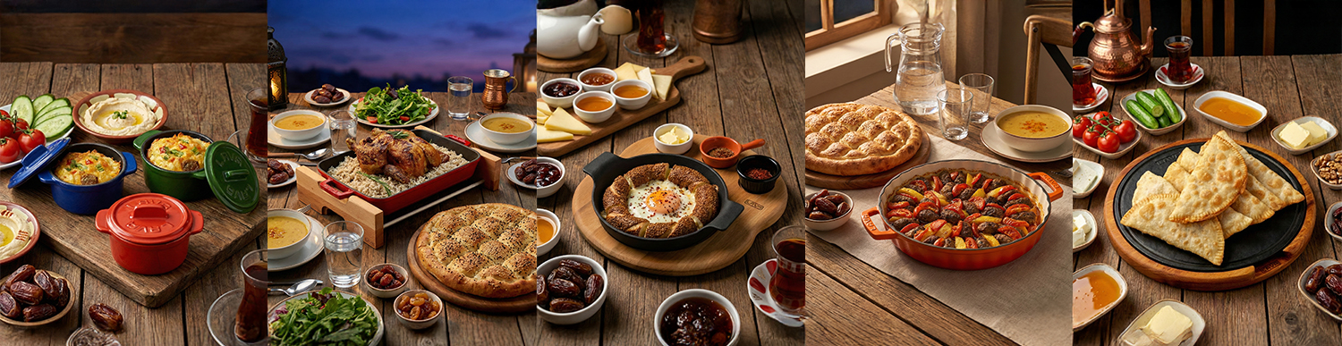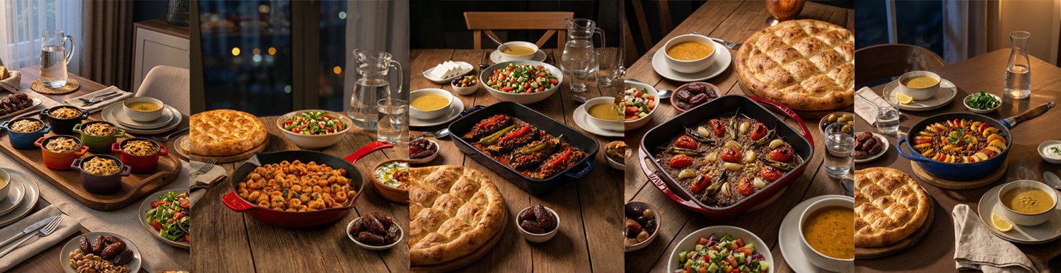 Isıyı eşit dağıtan döküm tencerelerle ağır ağır pişen ana yemekler, fırında nar gibi kızaran tarifler ve özenli sunum detaylarıyla Ramazan sofralarınıza fark katın.
